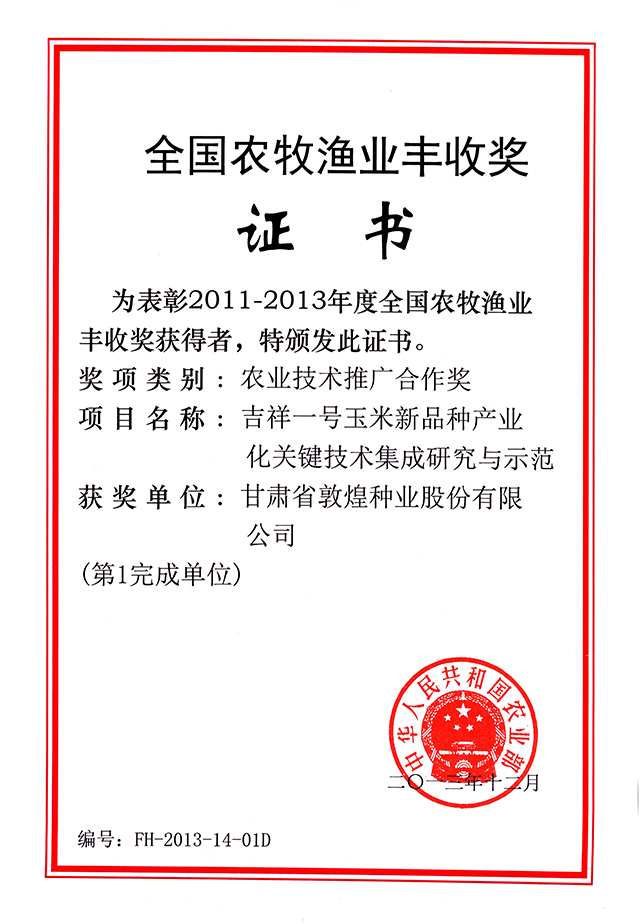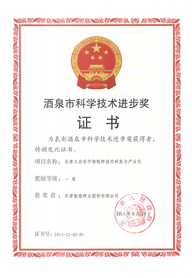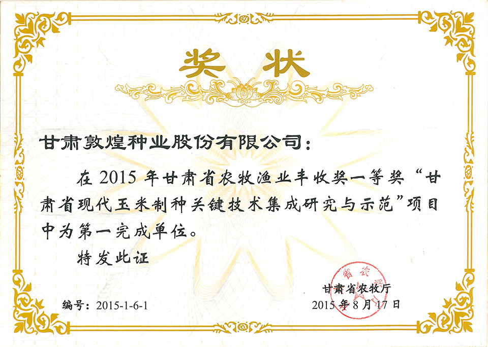 2015年甘肅省農牧漁業(yè)豐收獎一等